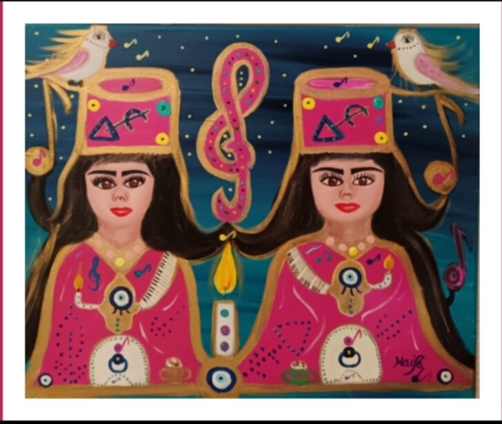 Thème: Deux reine jumelles, gardiennes du même souffle divin, unissent leurs cheveux comme un fil d’or entre les mondes.